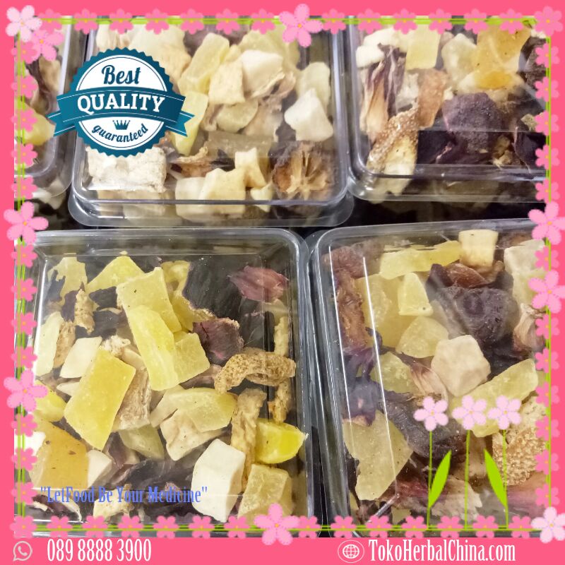 Teh Buah alami yang di pilih dari 100 persen Bunga Murni, Buah Segar, Rosella. Semuanya di olah dengan pengeringan Oven. Teh buah tidak mengandung Kafein, Pigmen dan Aditif buatan lainnya. Kaya akan Vitamin A, B, C, E dan asam mineral yang dibutuhkan tubuh. Vitamin C nya dapat berfungsi sebagai anti oksidan dan anti penuaan yang berfungsi mempertahankan kecantikan kulit Anda. Teh Herbal ini memiliki rasa manis dan asam alami buah-buahan yang sangat menyegarkan.